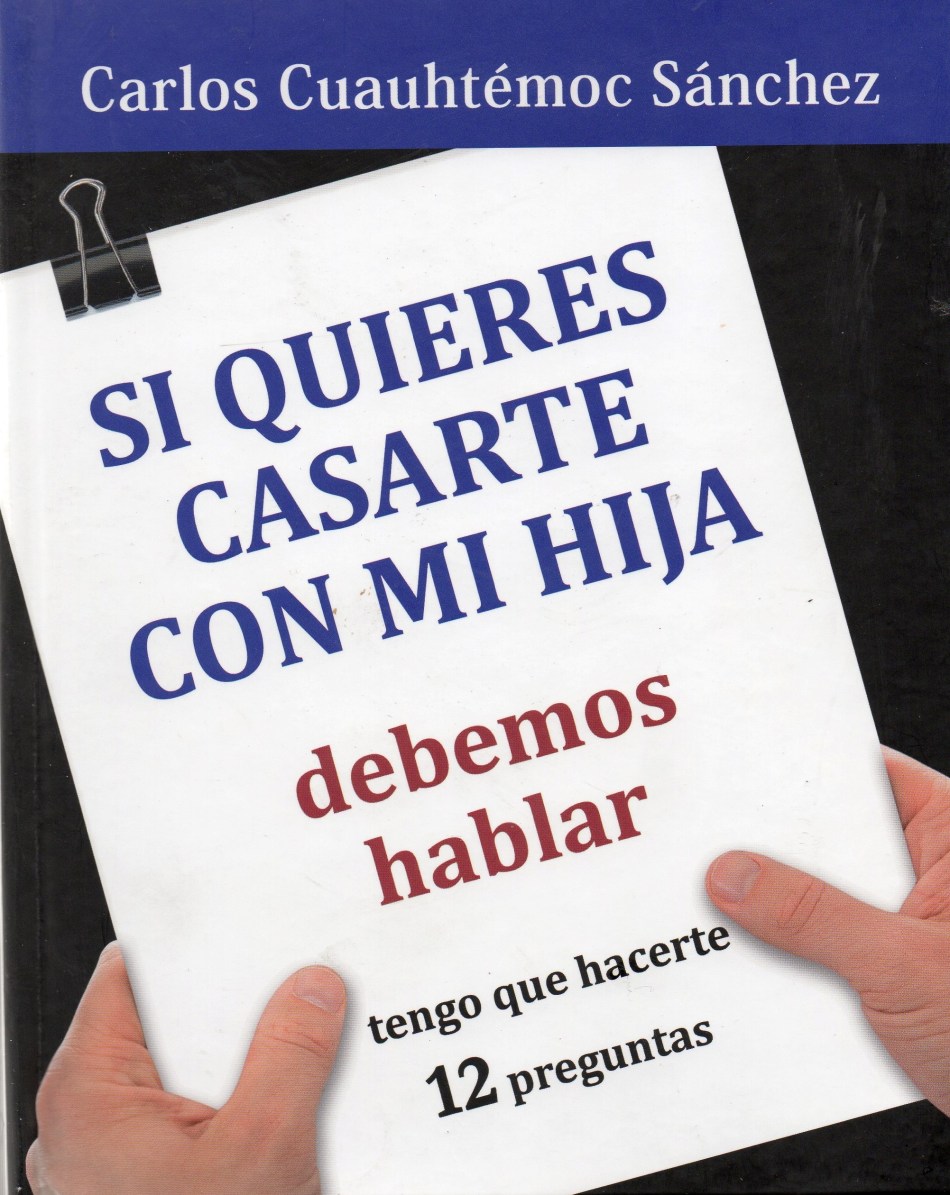 ”Debemos hablar, tengo que hacerte 12 preguntas”, así se dirige un hombre al novio de su hija para hablar claro sobre temas cruciales de la pareja, como dinero, sexo, discusiones, trato cotidiano, hijo y calidad de vida, en “Si quieres casarte con mi hija” (Editorial Diamante, 143 páginas), escrito por Carlos Cuauhtémoc Sánchez (“Un grito desesperado”, “La última oportunidad”, “Contraveneno”, “Desafío a disfrutar el amor”, “Los ojos de mi princesa”, entre otros).