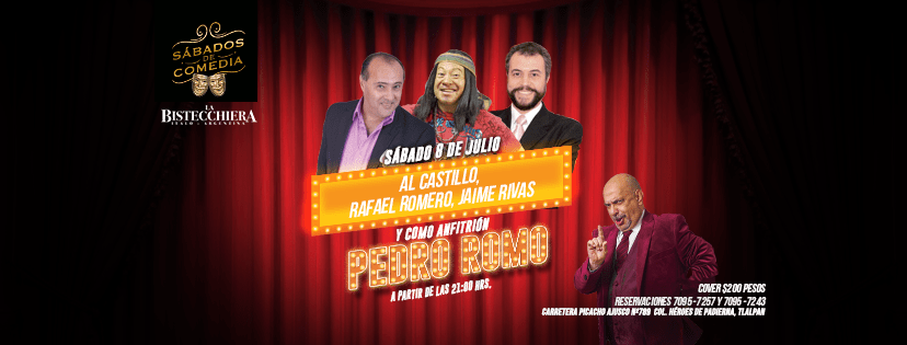 Este sábado 8 de julio en LA BISTECCHIERA (Carretera Picacho-Ajusco 789, Héroes de Padierna, Tlalpan, al sur de la CDMX), a partir de las 21 horas, la comedia tiene una cita con el público gracias a la tripleta conformada por AL CASTILLO, RAFAEL ROMERO y JAIME RIVAS, teniendo como anfitrión a PEDRO ROMO, y como cantante la calidad vocal de ROXANA SOTO.