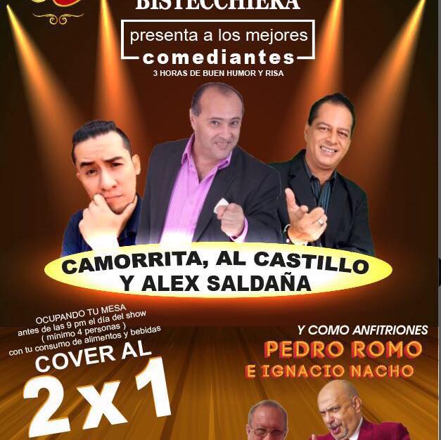En los SÁBADOS DE COMEDIA este 19 de agosto, a partir de las 21 horas, tripleta para la diversión con CAMORRITA, AL CASTILLO, y ALEX SALDAÑA, con sus anfitriones IGNACIO NACHO y PEDRO ROMO, en LA BISTECCHIERA (Carretera Picacho Ajusco 789, Héroes de Padierna, Tlalpan, al sur de la CDMX), con la promoción de cover al dos por uno.