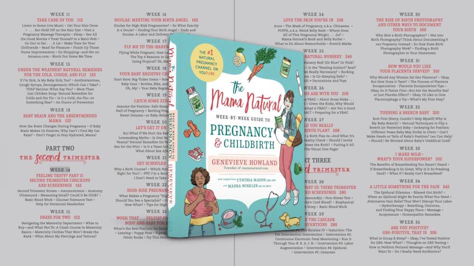 Alimentos nutritivos para ti y tu bebé (con recetas semanales), Cómo eliminar toxinas de tu rutina de belleza y limpieza, Remedios naturales para síntomas comunes, La verdad sobre las epidurales y otras intervenciones, Cómo crear tu equipo de parto, Cómo y por qué comer tu placenta ( o no), Analgésicos naturales en el parto, Qué hacer en cada etapa del parto, Cómo sortear las intervenciones del recién nacido, y Cómo empezar la lactancia con el pie derecho.