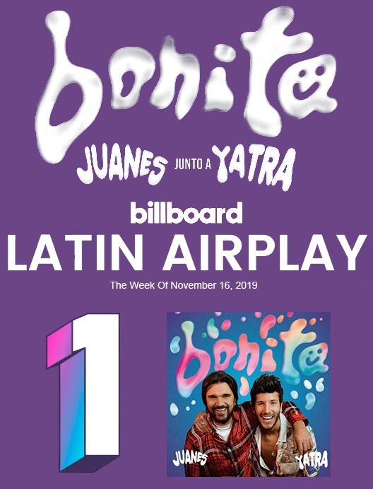 A tan solo días de ser honrado como la persona del año 2019 por la Academía de grabación Latina, Juanes alcanza por deudécima ocasión la posición #1 de radio de Billboard en los Estados Unidos con su más reciente sencillo «Bonita» (con Sebastián Yatra) encabeza esta semana la lista Latin Airplay.