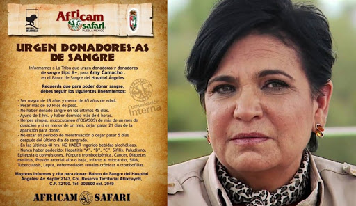 Fue el pasado 19 de junio que a través de sus redes sociales, Africam Safari compartió que urgían donadores de sangre tipo A+, para ayudar Amy Camacho, sin embargo, no dieron detalles de su estado médico. Para el 20 de junio nuevamente informaron que ya habían completado las donaciones de sangre y plaquetas necesarias para su recuperación; en este último comunicado, informaron que se encontraba estable y en recuperación.