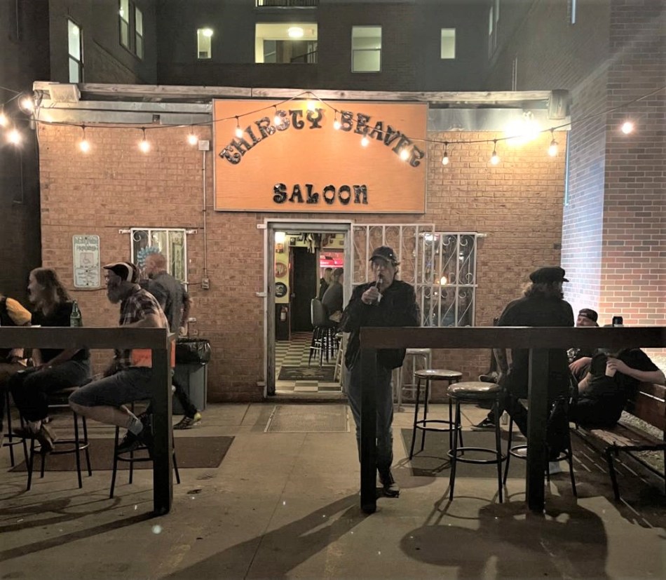 El Thirsty Beaver Saloon, con unas mesas largas en la acera, es una pequeña tienda encerrada por tres enormes edificios de apartamentos.