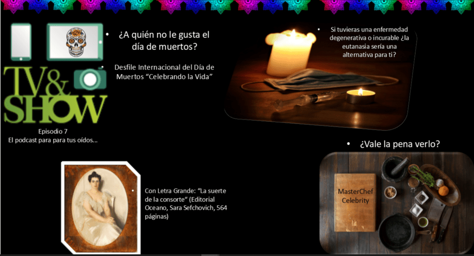 Si tuvieras una enfermedad degenerativa o incurable ¿la eutanasia sería una alternativa para ti?; MasterChef Celebrity ¿Vale la pena verlo?; Con Letra Grande: “La suerte de la consorte»; Desfile Internacional del Día de Muertos “Celebrando la Vida” desde el Zócalo hasta Campo Marte.