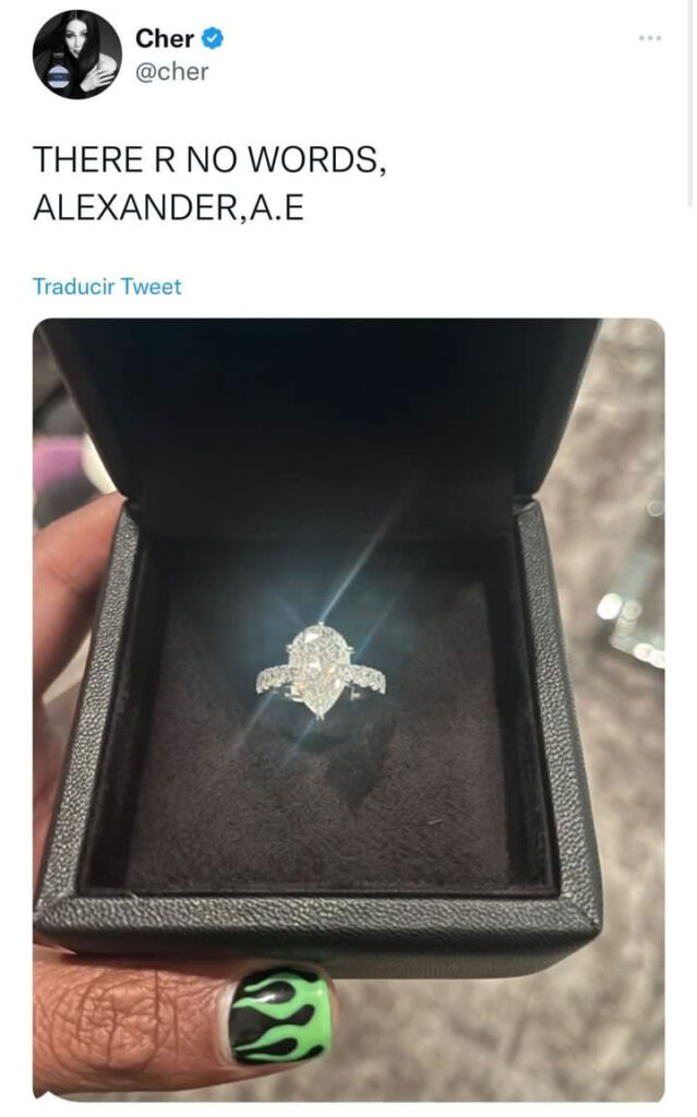 Ella tiene 76 años, él 40 menos. Y de inmediato surgieron rumores según los cuales la ‘ diosa del pop ‘ habría lucido la joya en el dedo anular de su mano izquierda. Cher no aportó muchos elementos más que agregar un «no tengo palabras» acompañando la foto y luego la explicación: «Me lo puse porque sus uñas son muy chulas», y las uñas pintadas de verde y negro son en realidad inusuales en el empresario musical que sostiene el estuche con el precioso regalo.