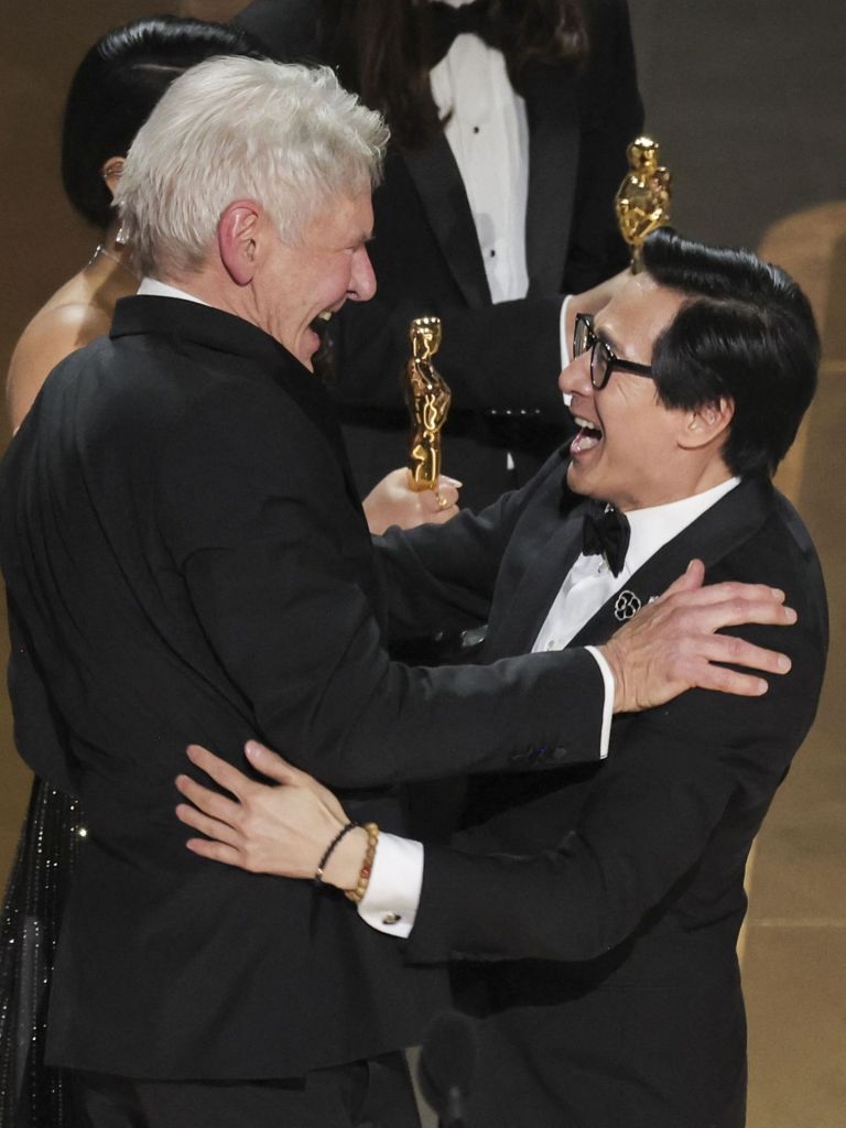 Un extasiado Quan, quien hizo su debut en la pantalla grande cuando era un niño en Indiana Jones and the Temple of Doom de 1984, abrazó y besó emocionado a Ford en la mejilla después de que el actor de 80 años le entregó el premio a la mejor película por Everything Everywhere All at Once.